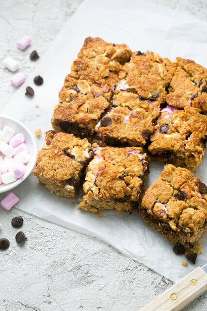 - Add the chocolate chips and marshmallows to the remaining batter and stir by way of.